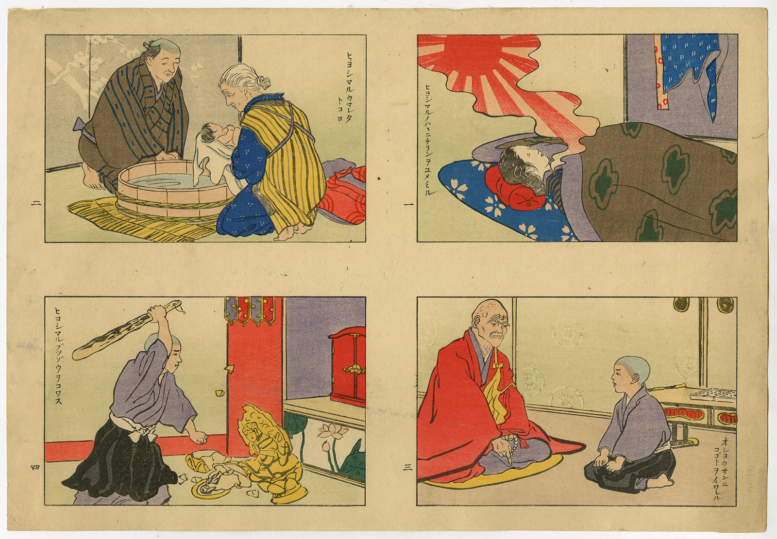Onderwerp: Antieke druk, zonder titel. Deze originele Japanse prent toont vier afbeeldingen die de Japanse folklore uitbeelden.