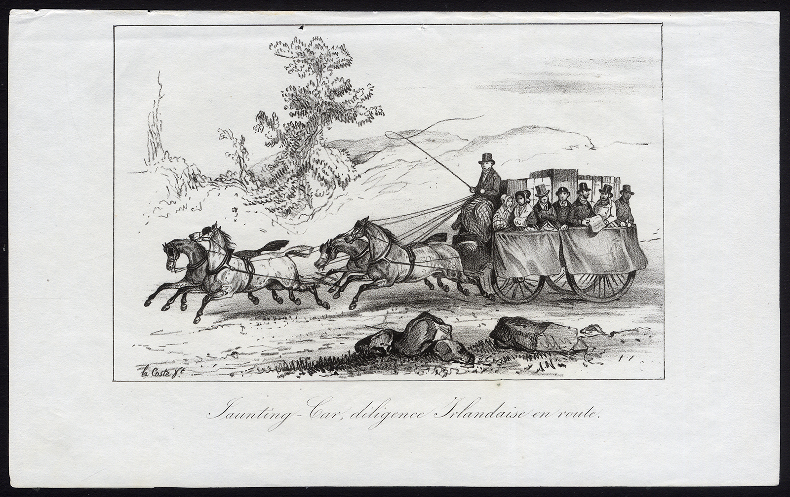 Onderwerp: Plaat: ‘Jaunting-Car, diligence Irlandaise onderweg’. Dit bord toont een Irish Jaunting Car onderweg.