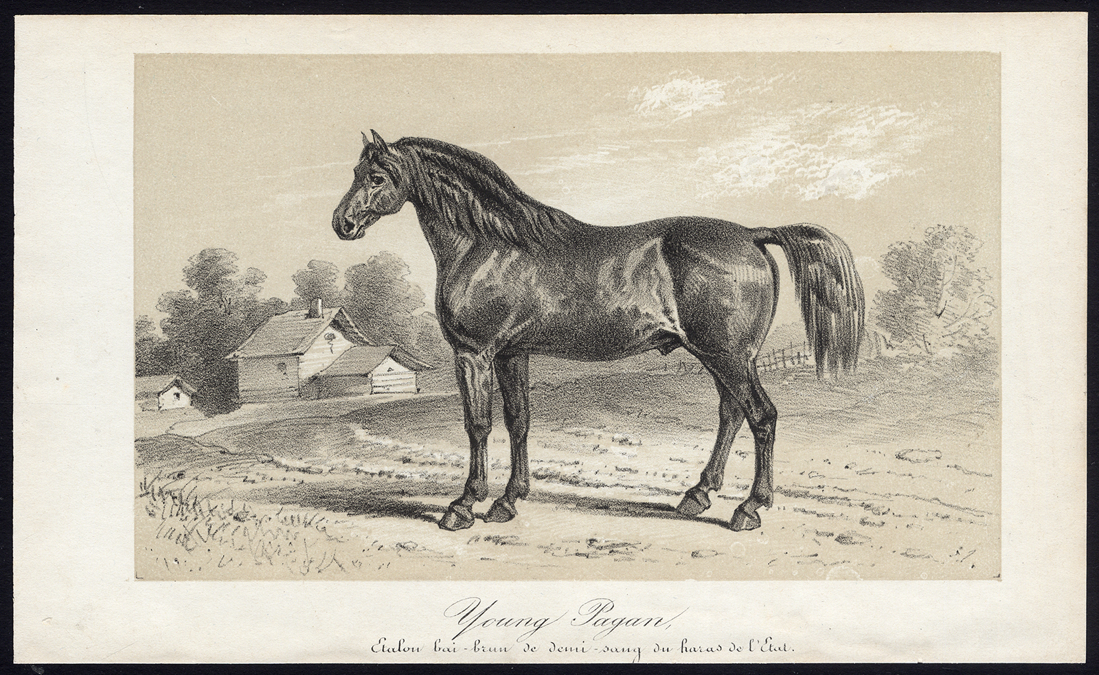 Onderwerp: Plaat: ‘Young Pagan, etalon bai-brun de demi sang du Haras de l’Etat’. Op dit bord staat de hengst Young Pagan afgebeeld, een warmbloedbruin paard uit de stal van Etat.