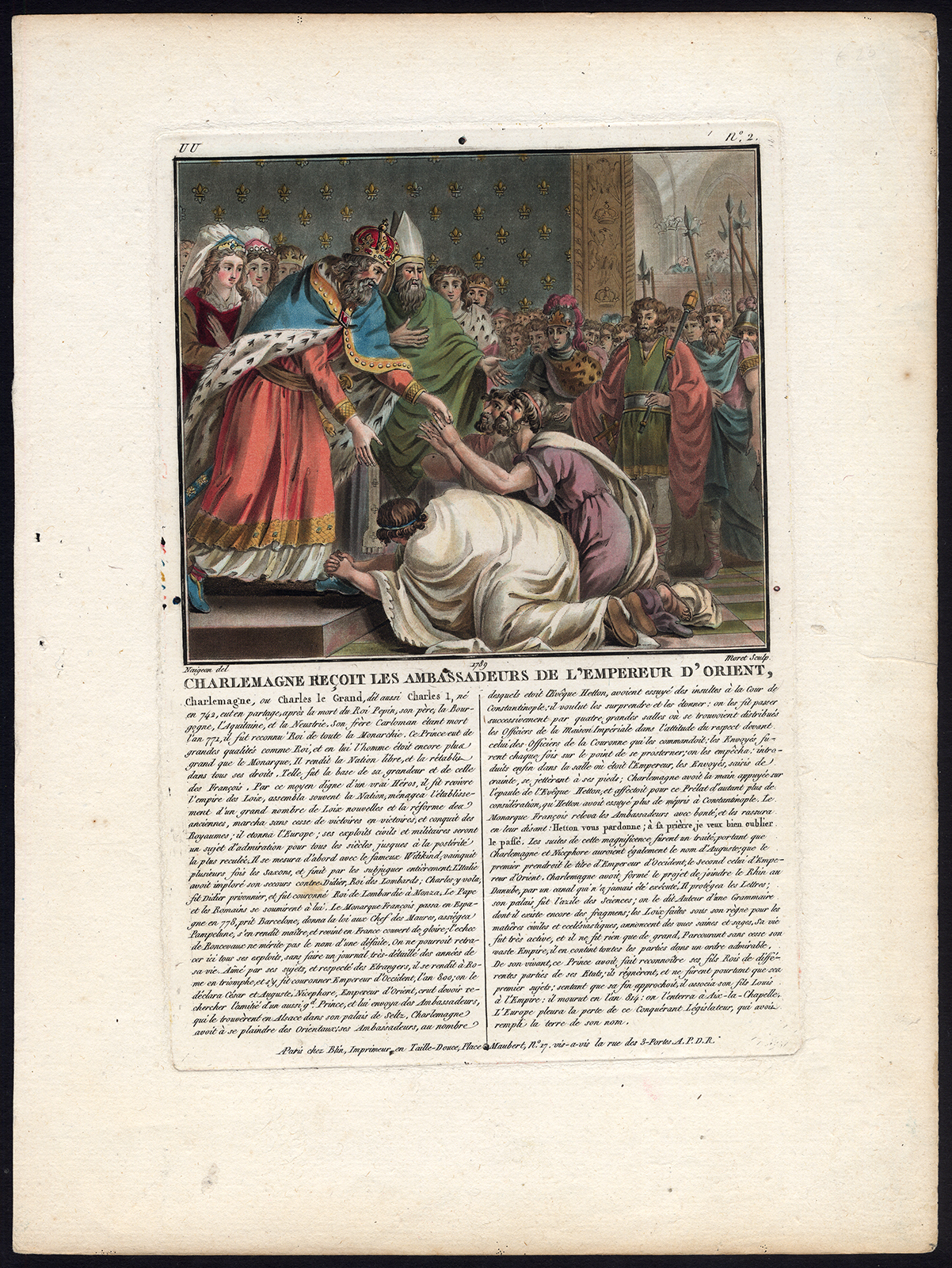 Onderwerp: Plaat: ‘Karel de Grote recoit les Ambassadeurs de l’empereur d’Orient.’ (Karel de Grote ontvangt de ambassadeurs van de oostelijke keizer). Karel de Grote (742/747/748 – 814), ook bekend als Karel de Grote (Latijn: Carolus of Karolus Magnus, Frans: Charles Le Grand of Charlemagne, Duits: Karl der Grosse, Italiaans: Carlo Magno of Carlomagno) of Charles I, was koning van de Franken die tijdens de middeleeuwen het grootste deel van West-Europa verenigde en de basis legde voor het moderne Frankrijk en Duitsland. Hij nam de Frankische troon over vanaf 768, werd koning van Italië vanaf 774 en was vanaf 800 de eerste erkende Romeinse keizer in West-Europa sinds de ineenstorting van het West-Romeinse rijk drie eeuwen eerder. De uitgebreide Frankische staat die hij stichtte, wordt het Karolingische rijk genoemd. Beschrijvende tekst in het Frans onder de afbeelding.