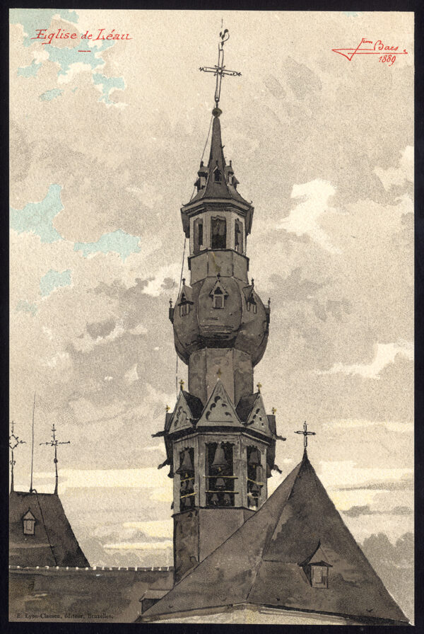 Beschrijving: Deze originele antieke print is afkomstig uit ‘Tours Et Tourelles Historiques De La Belgique’ van Jean Baes, gepubliceerd in België ca. 1890. Een verzameling van 50 ingetikte kleurenlitho’s naar aquarelschilderijen van Jean Baes met afbeeldingen van de historische torens en torentjes van België.