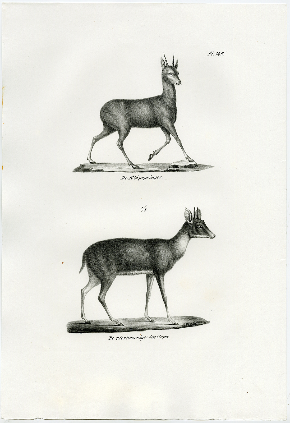 Onderwerp: Antieke prent, getiteld: ‘Pl. 149. De Klipspringer – De vierhoornige Antilope.’ – Dit bord toont de Klipspringer en de Vierhoornige Antilope, oftewel Chousingha.