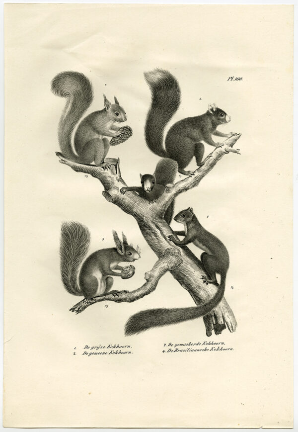 Onderwerp: Antieke prent, getiteld: ‘Plaat 100: ‘1. de grijze eekhoorn – 2. de gemaskerde eekhoorn – 3. de gemeene eekhoorn – 4. de Braziliaansche eekhoorn’.’ – Dit bord toont eekhoornsoorten.