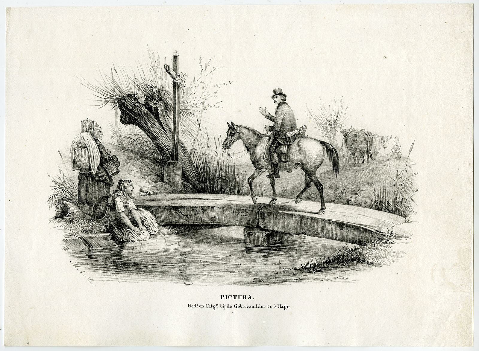 Onderwerp: Antieke prent, getiteld: ”Pictura.” – Deze originele antieke prent toont een man op een paard met koeien op de achtergrond. Links zijn vrouwen kleding aan het wassen.