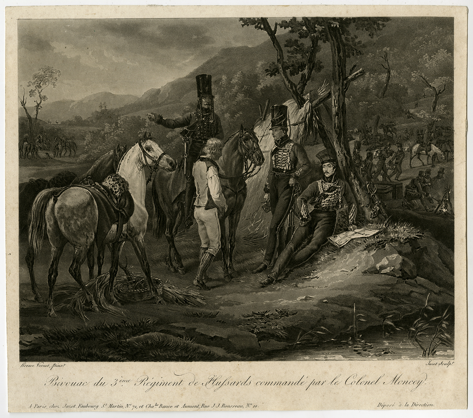 Antieke prent-KOLONEL MONCEY-BIVOUAC-CAVALRIE-HUSSARS-Vernet-Jazet-c. 1820
