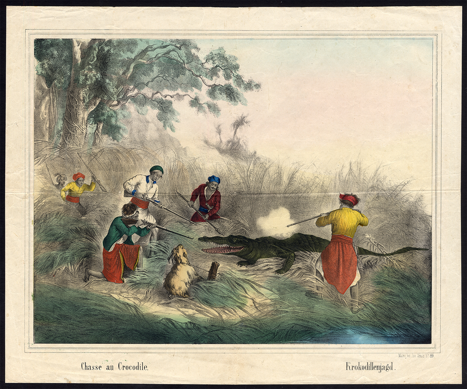 Onderwerp: Plaat: ‘Chasse au Crocodile – Krokodillenjagd.’ Op deze plaat zijn Aziatische inboorlingen te zien die een krokodil neerschieten.