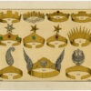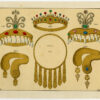 Onderwerp: Antieke druk, zonder titel. Deze antieke prent toont sieraden gemaakt van goud en edelstenen; kronen.
