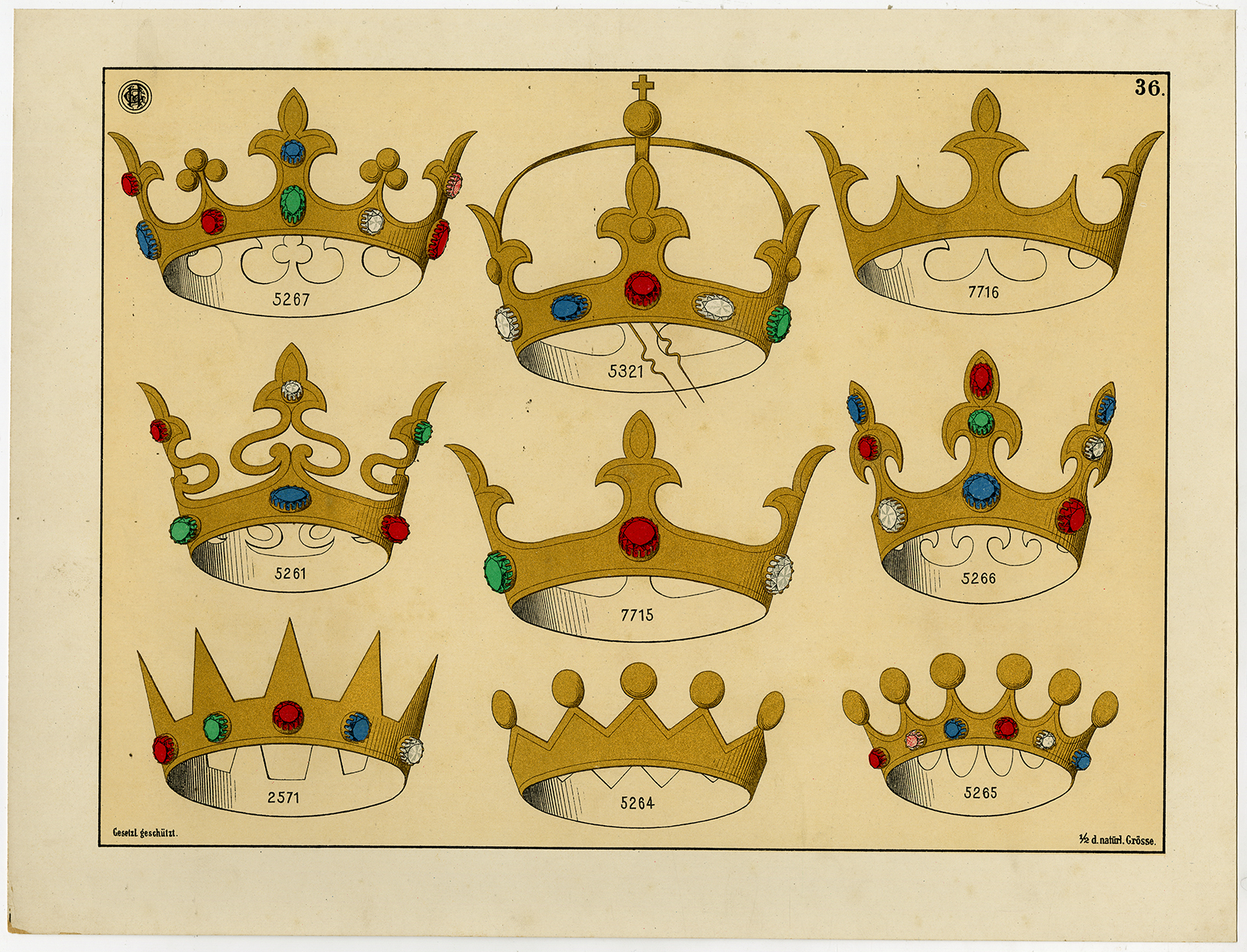 Antieke prent-KROON-GOUD-edelsteen-SIERADEN-PLAAT 36-Anoniem-c. 1890