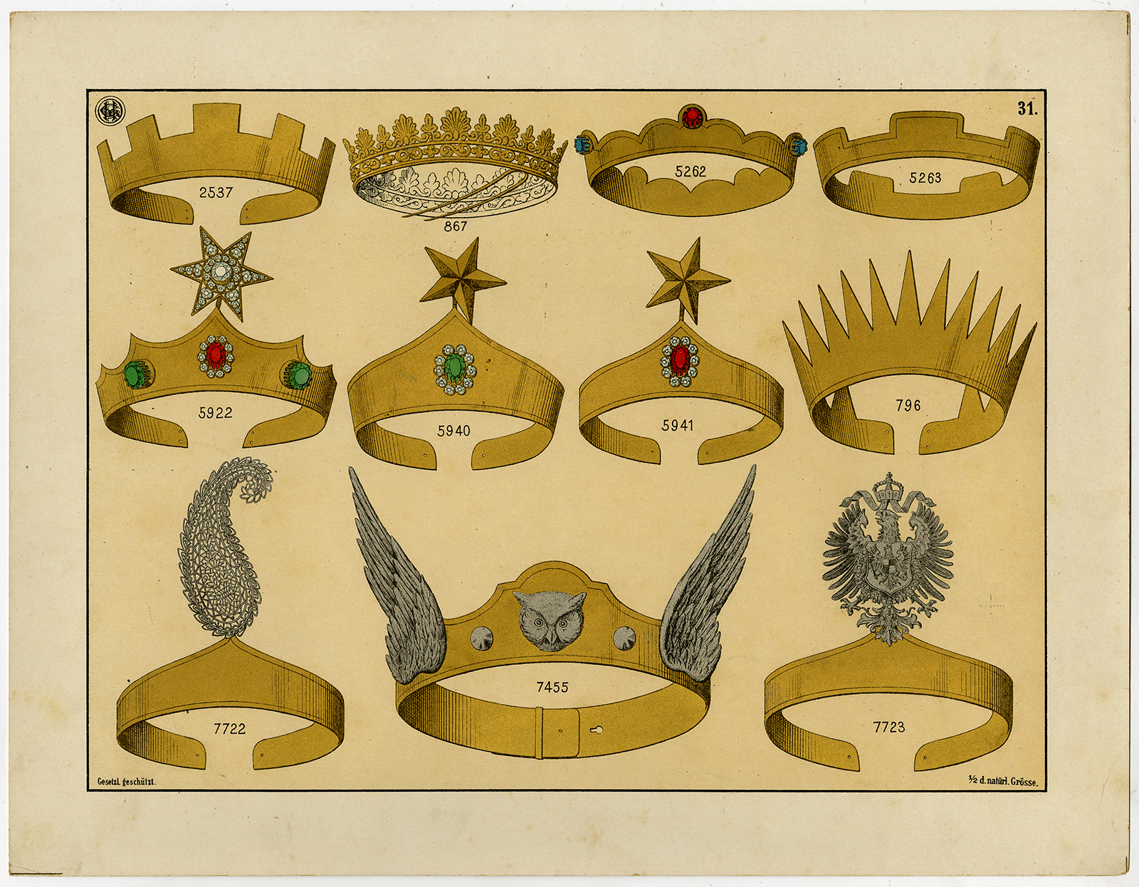 Antieke prent-KROON-GOUD-edelsteen-TIARA-SIERADEN-PLAAT 31-Anoniem-c. 1890