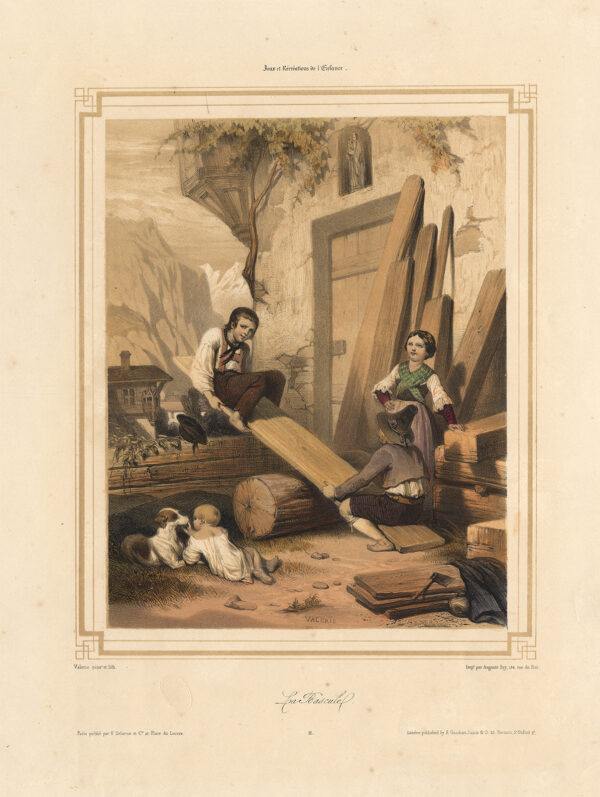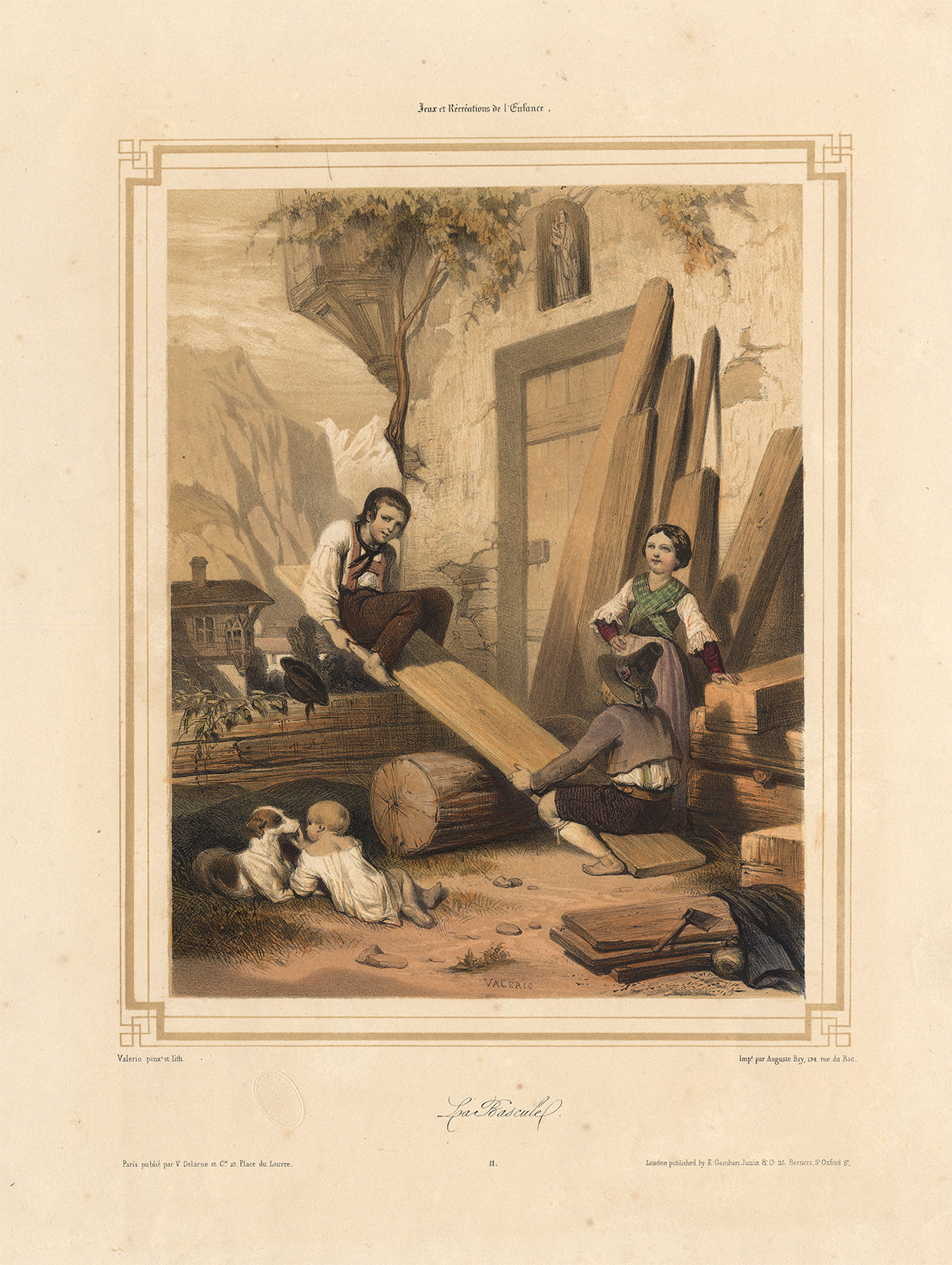 Antieke prent-LA BASCULE-WIP-SPEL-HOND-KINDEREN-SPELEN-Valerio-1850