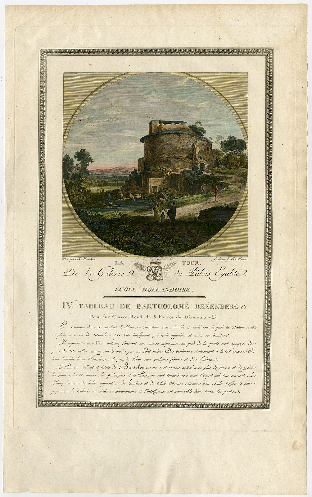 Onderwerp: Antieke prent, getiteld: ”La Tour. De la Galerie du Palais Egalite. Ecole Hollandaise. Ive Tableau de Bartholome Breenberg (à)” – Deze originele antieke prent toont een landschap met een ruïne naar een schilderij van Bartholomeus Breenbergh.