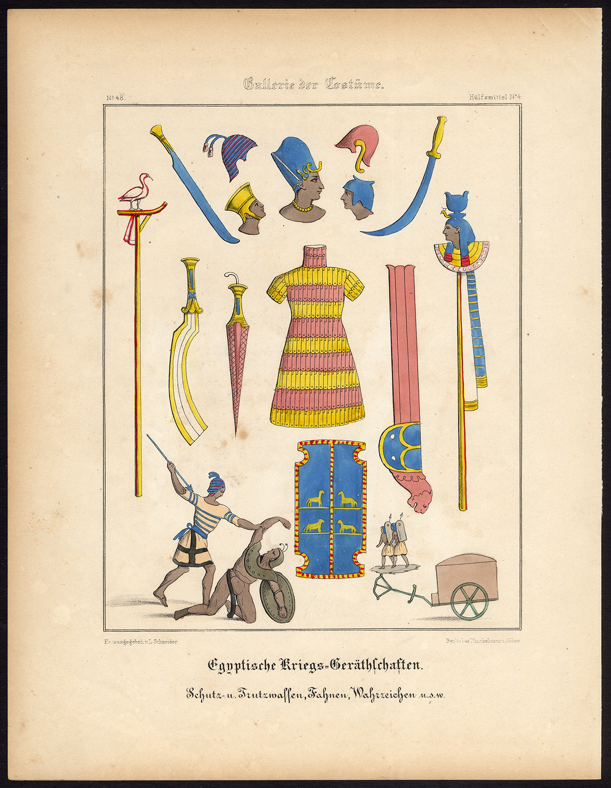 Onderwerp: Plaat: ‘Egyptische Kriegs-Gerathschaften. Schutz- u. Trutzwaffen, Fahnen, Wahrzeichen usw’. Deze plaat toont oude Egyptische bewapening; wapens, hoofdtooi, pantser, standaarden enz.