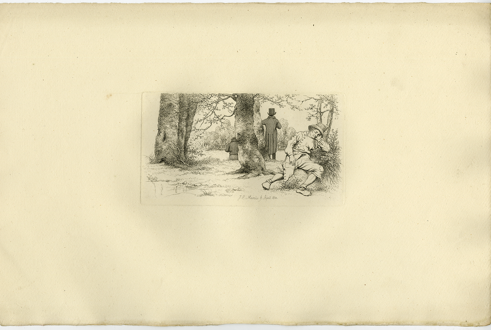 Onderwerp: Antieke druk, zonder titel. Een landschap met drie figuren tussen de bomen. Eén van de mannen slaapt.