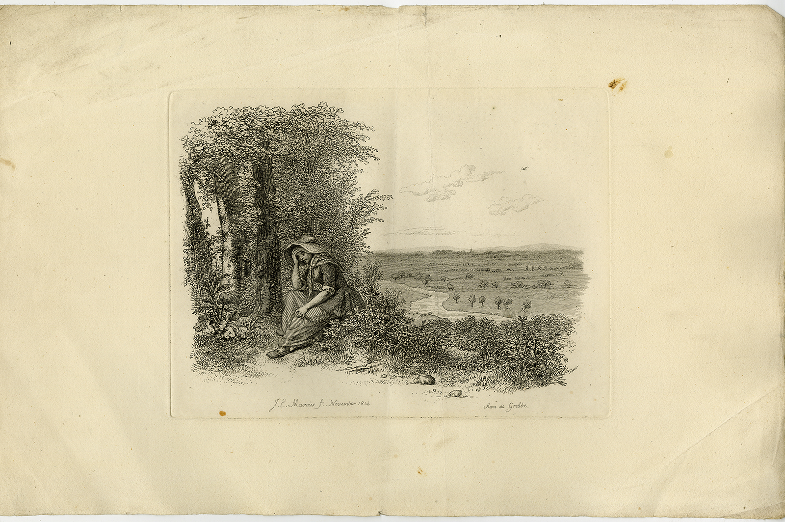 Antieke Prent-LANDSCHAP-VROUW-ZITT-BOOM-GREBBE-1814-Marcus-1834