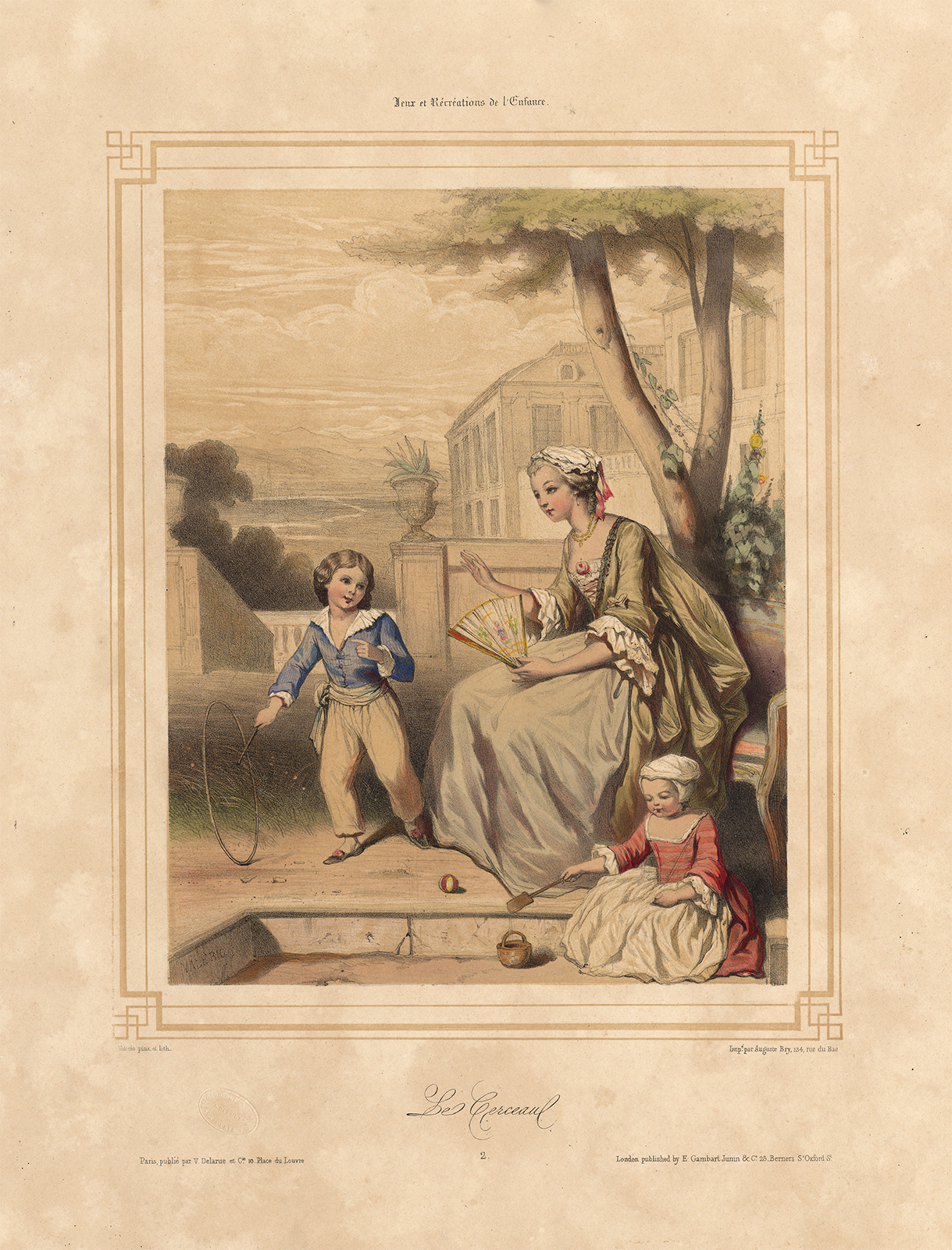 Antieke prent-LE CERCEAU-KINDEREN-SPEL-KOSTUUM-HOOP ROLLING-FAN-Valerio-1850