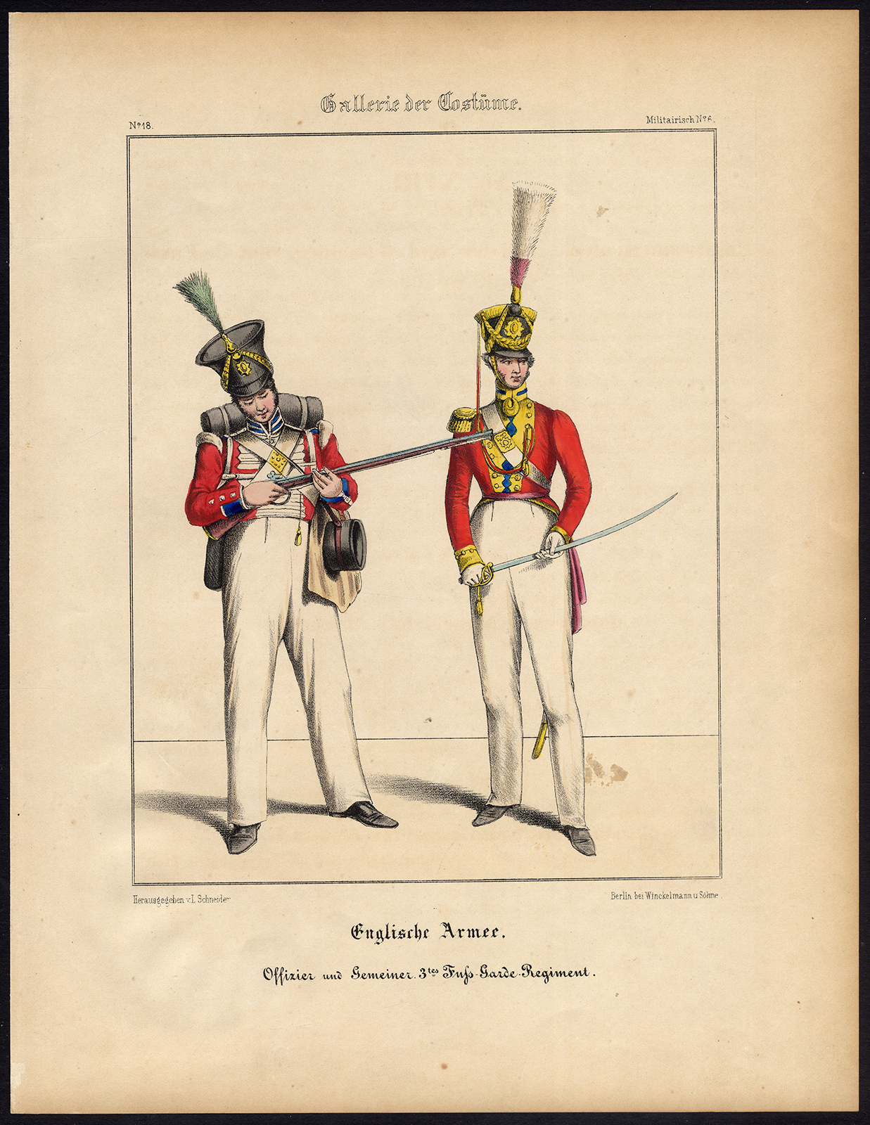 Onderwerp: Plaat: ‘Englische Armee, Offizier und Gemeiner 3tes Fuss-Garde-Regiment’. (Engels leger, officier en soldaat van de 3e voetwacht).