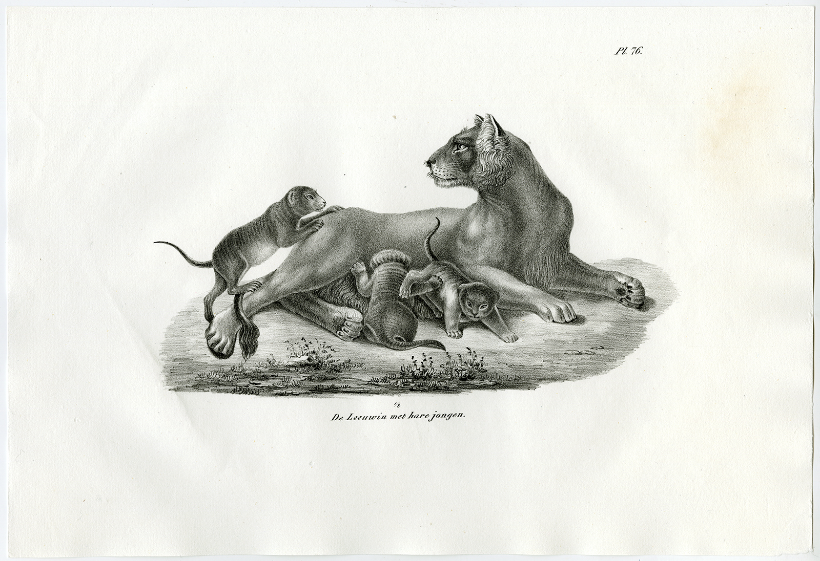 Onderwerp: Antieke prent, getiteld: ‘Pl. 76. De Leeuwin ontmoette hare jongen.’ – Dit bord toont een leeuwin met welpen.
