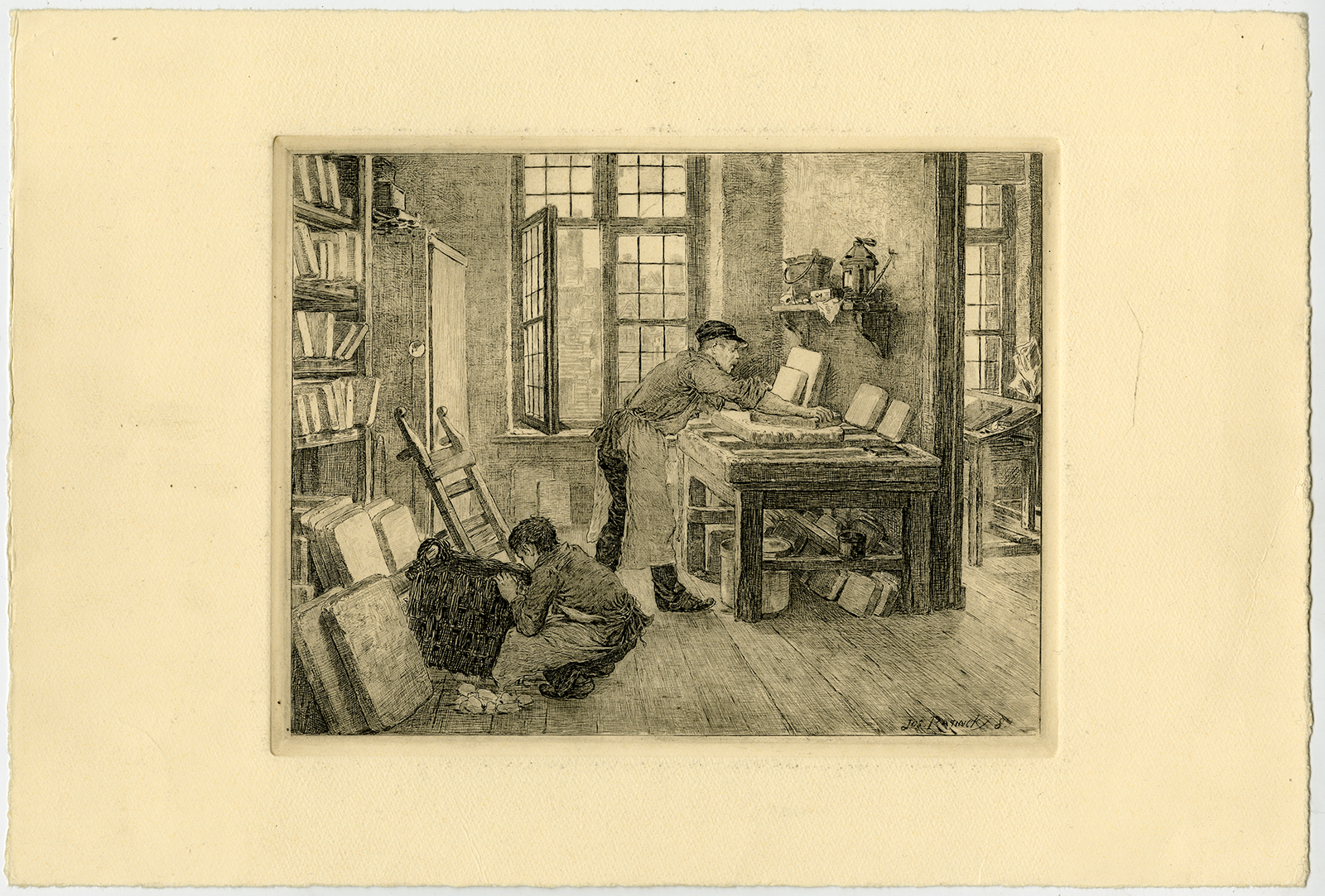 Onderwerp: Antieke druk, zonder titel. Deze originele antieke prent toont een lithograaf aan het werk, eind 19e eeuw.