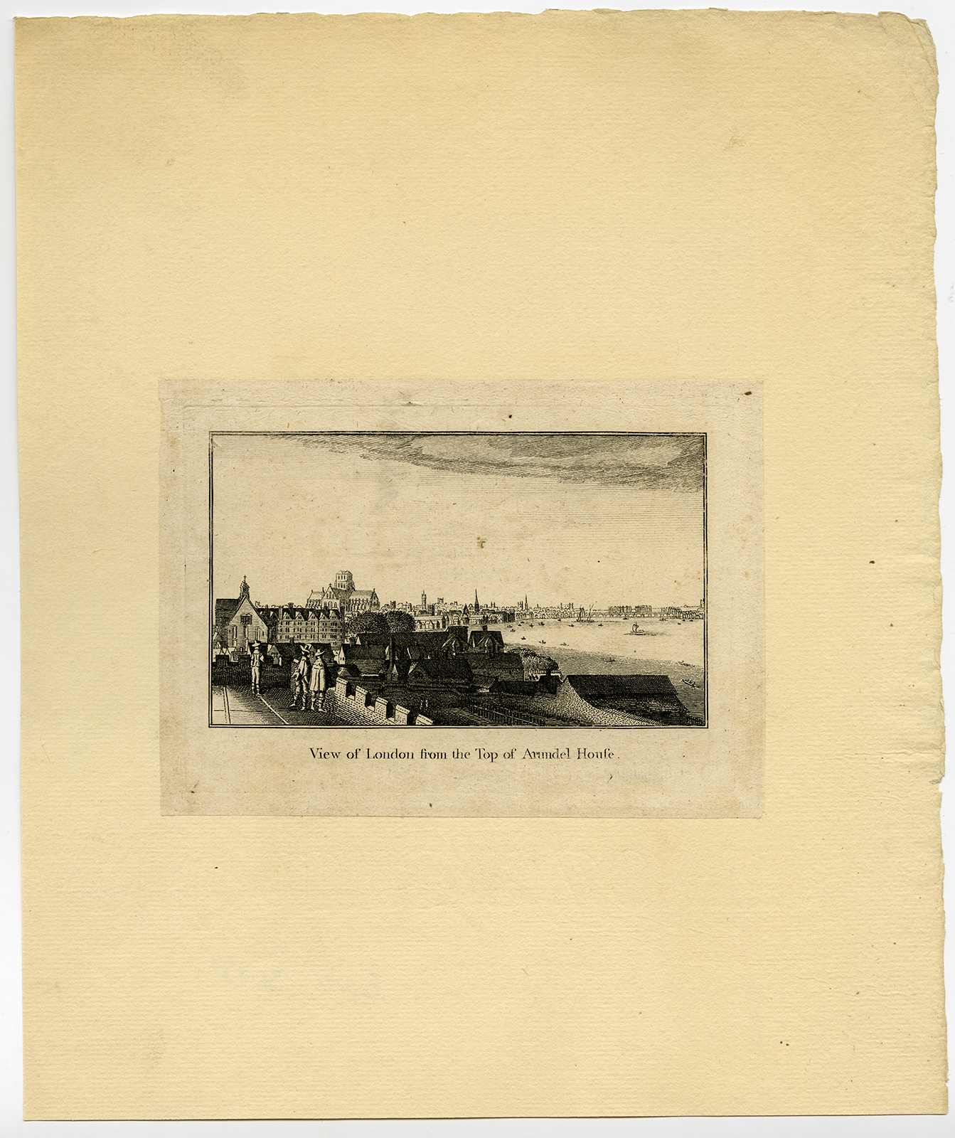 Onderwerp: Plaat: ‘Gezicht op Londen vanaf de top van Arundel House’. Deze plaat toont een uitzicht vanaf Arundel House; drie mannen met breedgerande hoeden, één met een mantel, staande op het dak van Arundel House, van achteren gezien; St Paul’s en de gebouwen van de tempel in de verte tussen de daken gezien, met aan de rechterkant boten in de Theems.