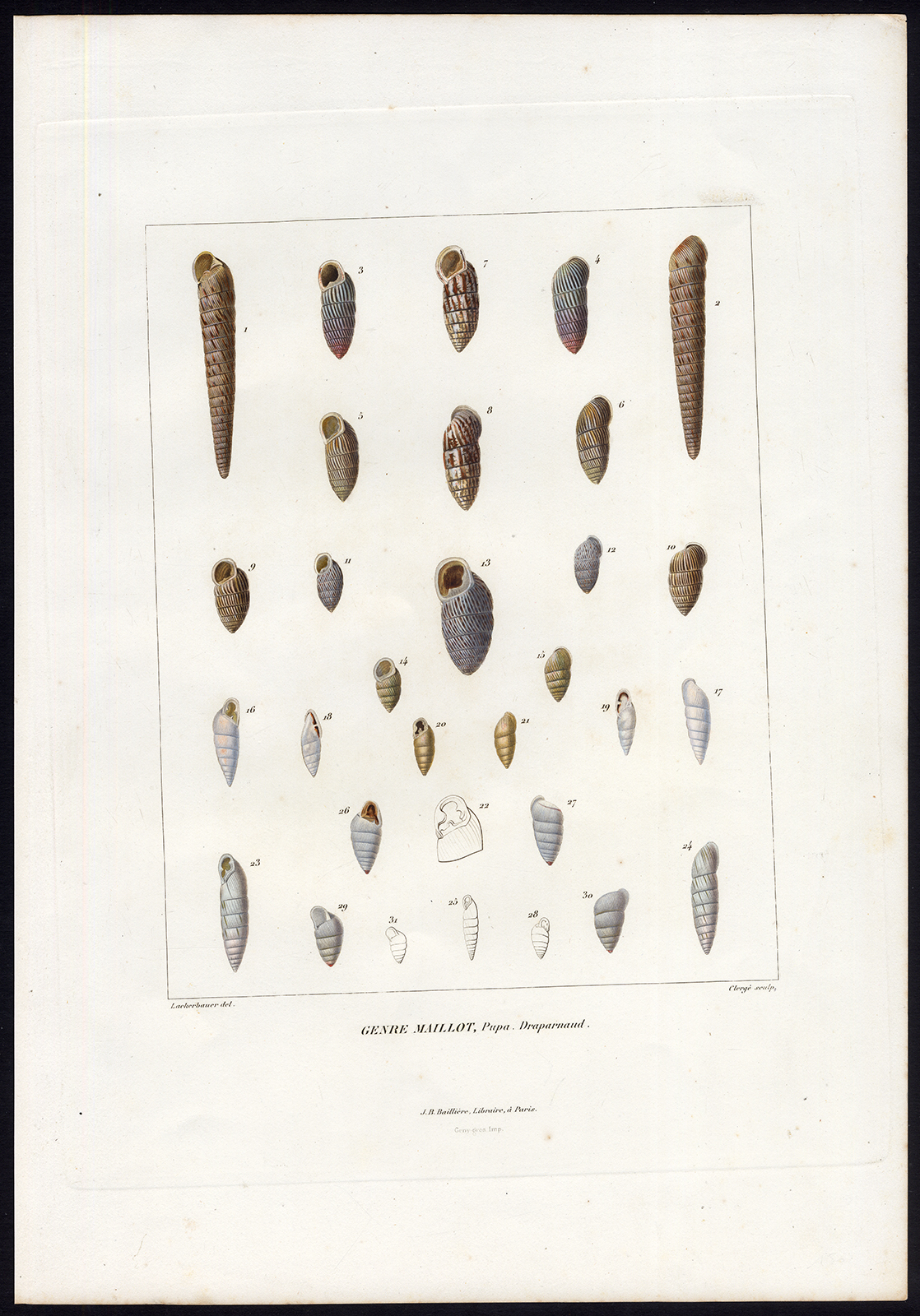 Onderwerp: Plaat: ‘Genre Maillot, Pupa Draparnaud’. Deze plaat toont schelpen van mariene buikpotige weekdieren.