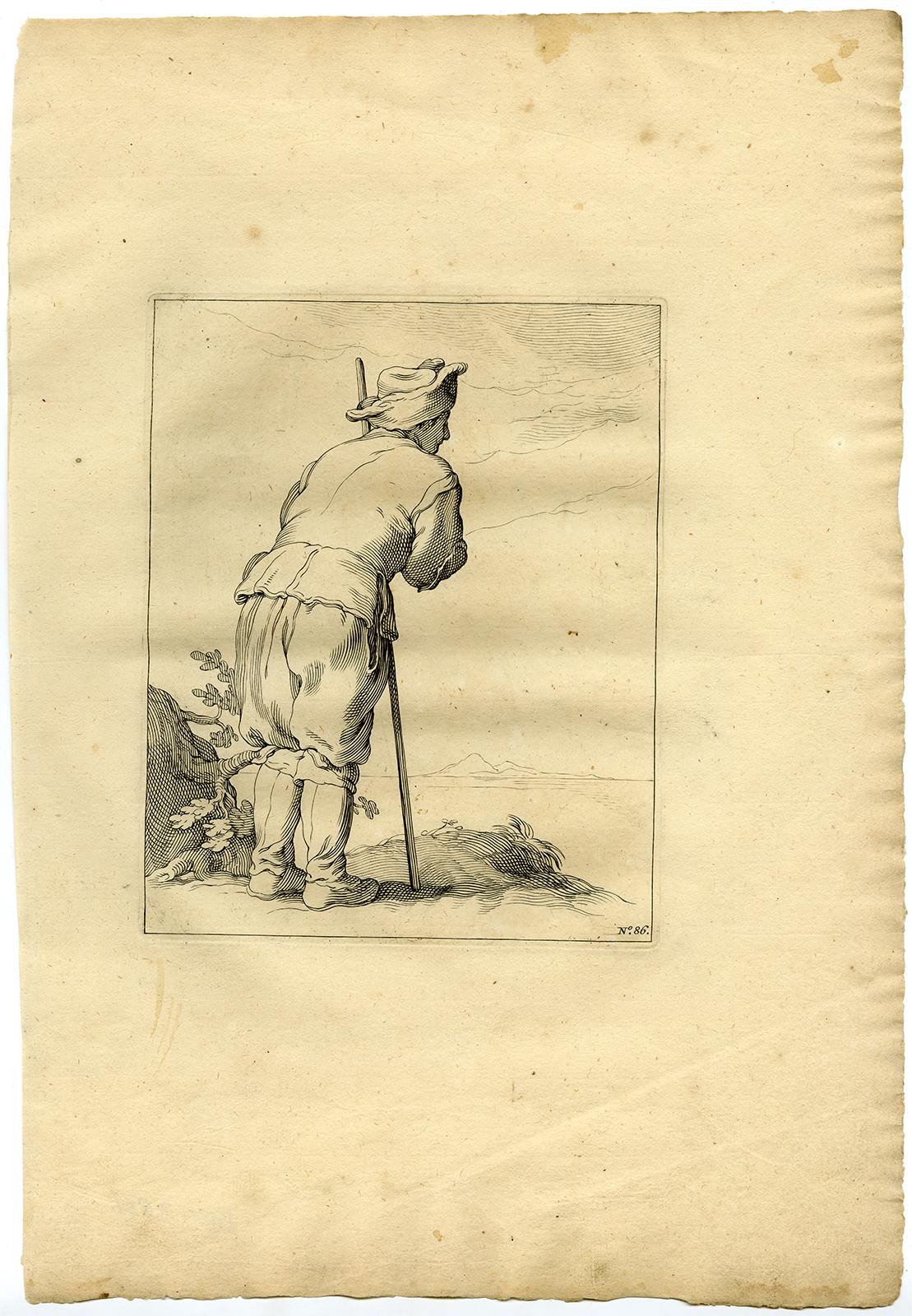 Onderwerp: Antieke prent, getiteld: ‘No. 86. ‘ – Antieke meesterafdruk, zonder titel. Deze figuurstudie toont een man die met een stok staat.