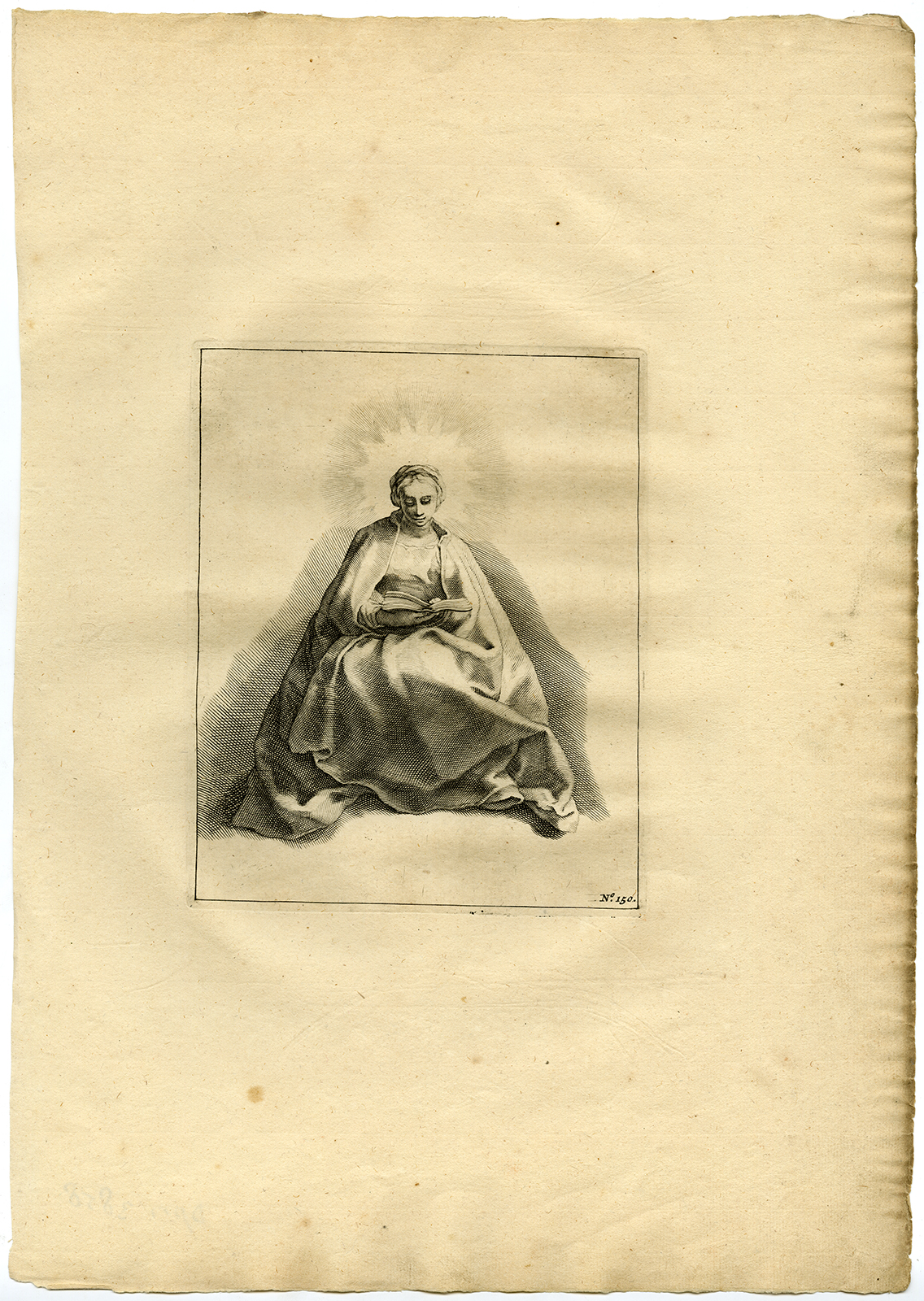 Onderwerp: Antieke prent, getiteld: ‘No. 150. ‘ – Antieke meesterafdruk, zonder titel. Deze figuurstudie toont een vrouw in gewaad die een boek zit te lezen, mogelijk de Maagd Maria.