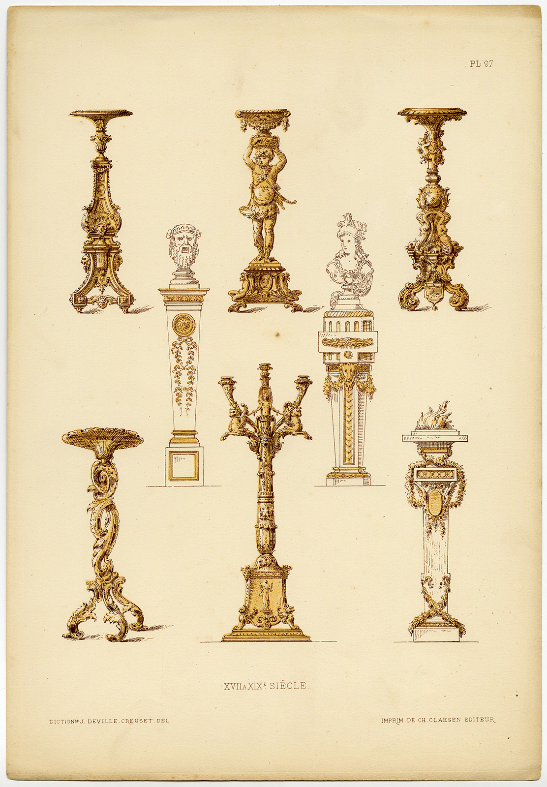 Antieke prent-MEUBILAIR-17E EEUW-KANDELAARS-pl. 97-Deville Creuset-1850