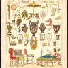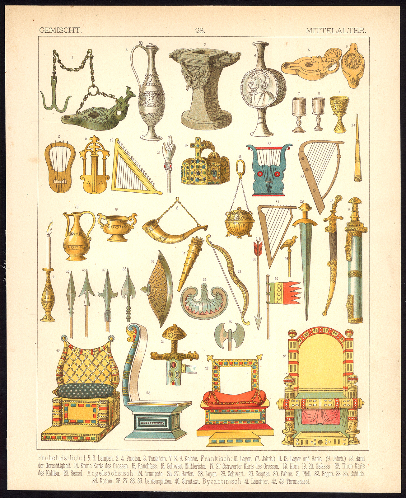 Onderwerp: Plaat 28: ‘Gemischt – Mittelalter.’ Dit bord toont Frankische, Angelsaksische en Byzantijnse voorwerpen uit de vroege middeleeuwen; wapens, muziekinstrumenten, meubels, sieraden, lampen etc.