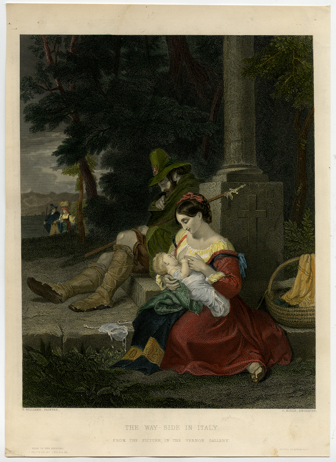 Onderwerp: Antieke prent, getiteld: ”De kant van de weg in Italië (à).” – Deze originele antieke prent toont een rustieke verhalende scène in Italië. Een moeder houdt haar baby tegen haar borst, achter haar doet een man een dutje.