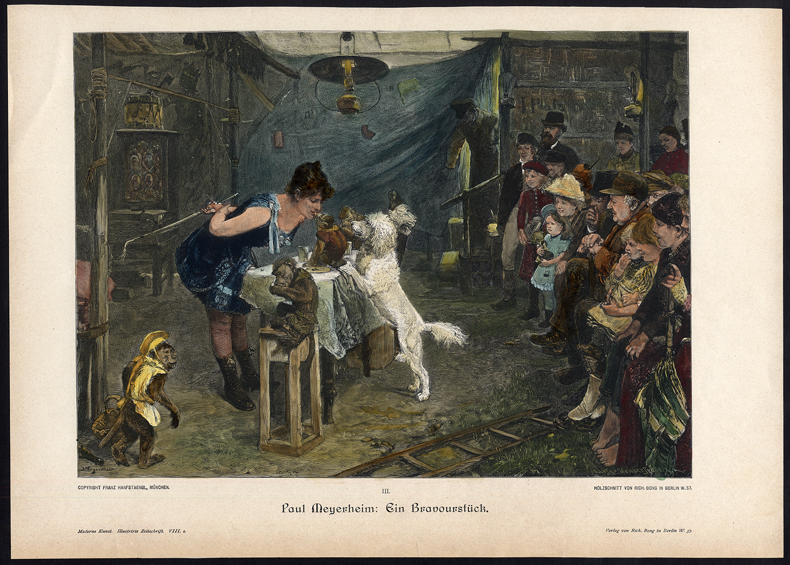 Onderwerp: Plaat: ‘Paul Meyerheim: Ein Bravourstuck.’ Dit bord toont een show waarbij dieren trucjes doen voor publiek.
