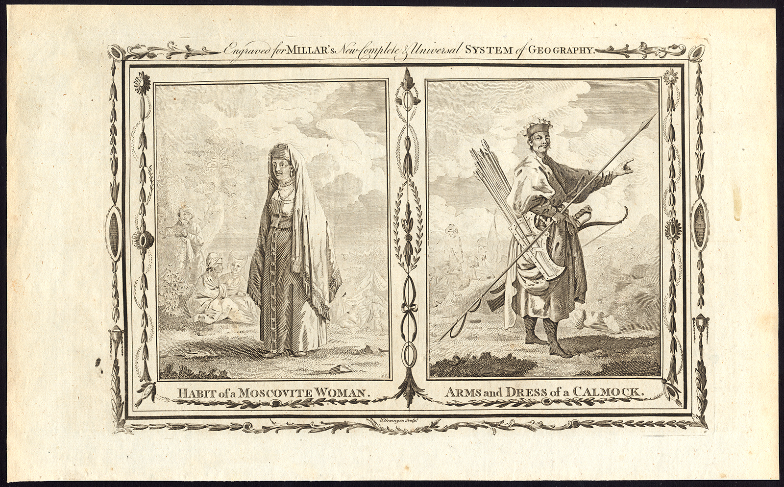 Onderwerp: Plaat: ‘Gewoonte van een Moscovische vrouw – Wapens en kleding van een Calmock.’ Dit bord toont Russische kostuums; een vrouw uit Moskou en een man uit Kalmukkië.