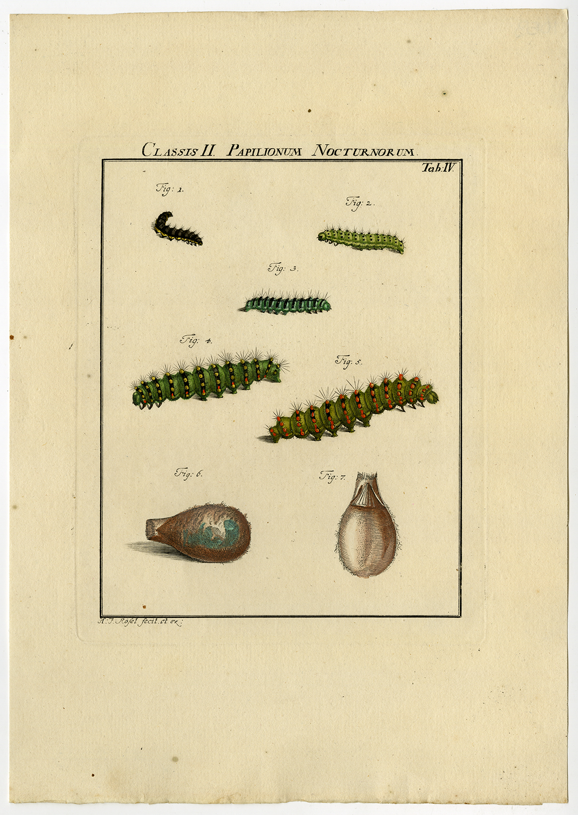 Onderwerp: Plaat: ‘Classis II Papilionum Nocturnorum’. Op dit bord zijn rupsen van motten te zien.