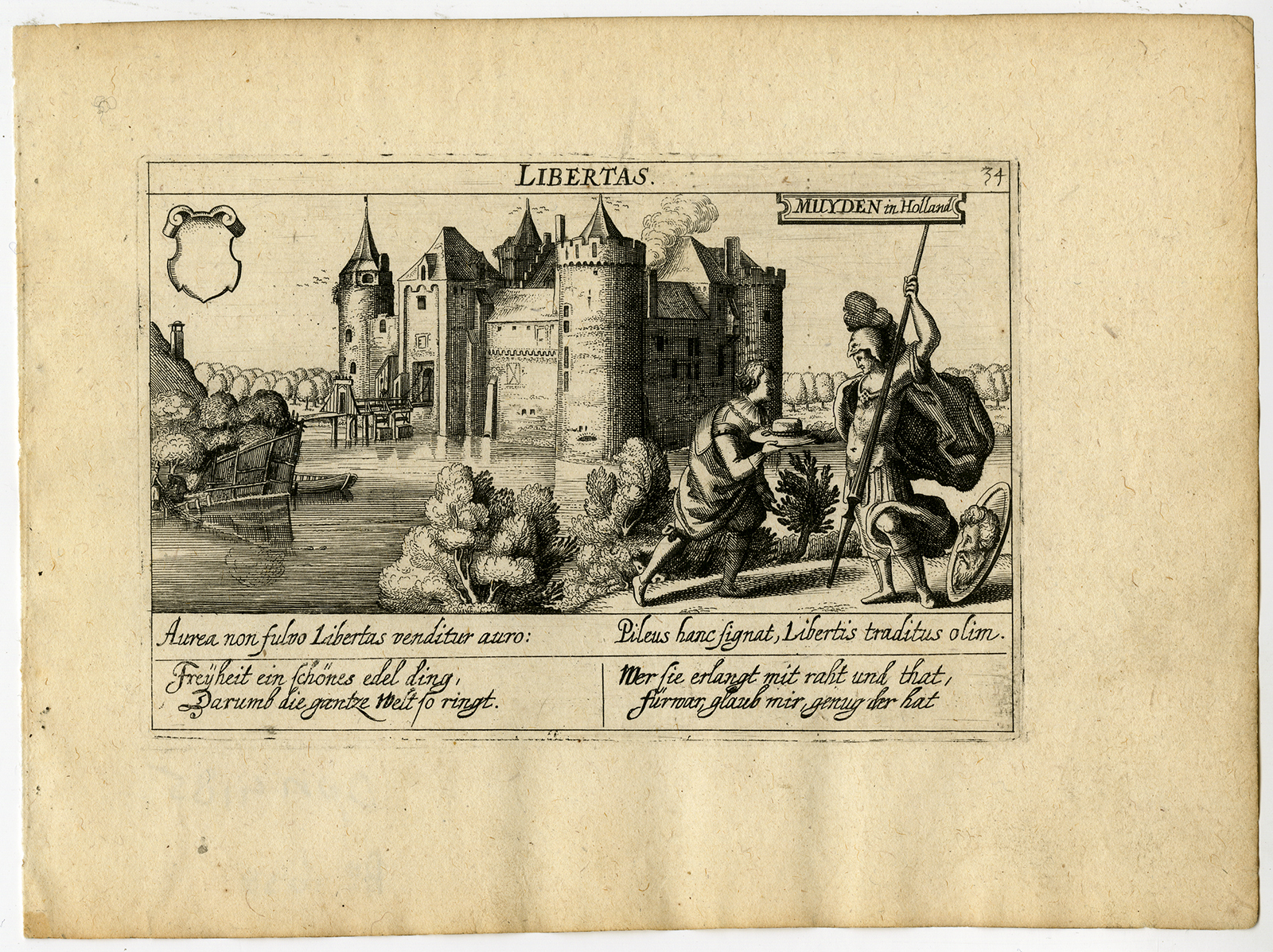 Onderwerp: Antieke prent, getiteld: ”Libertas. Muyden in Holland.” – Deze originele antieke print toont een zicht op het Muiderslot (Muiden Castle), in Nederland.