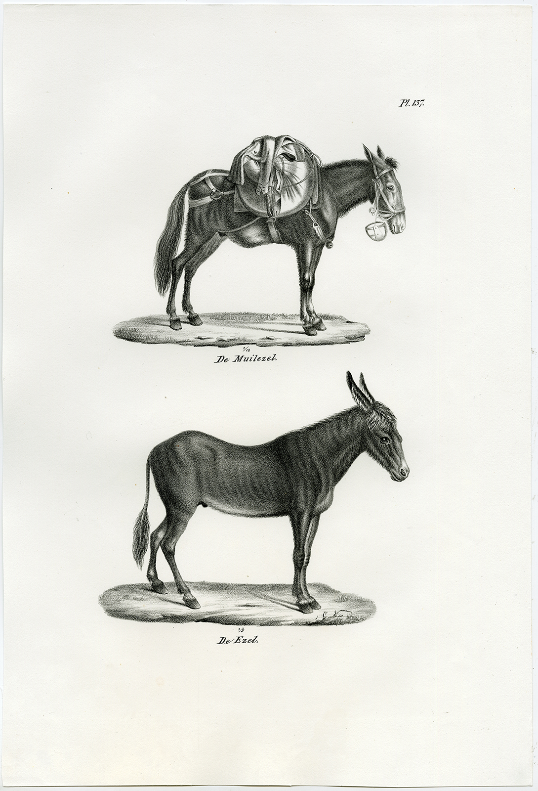 Onderwerp: Antieke prent, getiteld: ‘Pl. 137. De Muilezel – De Ezel.’ – Dit bord toont de muilezel en de ezel.