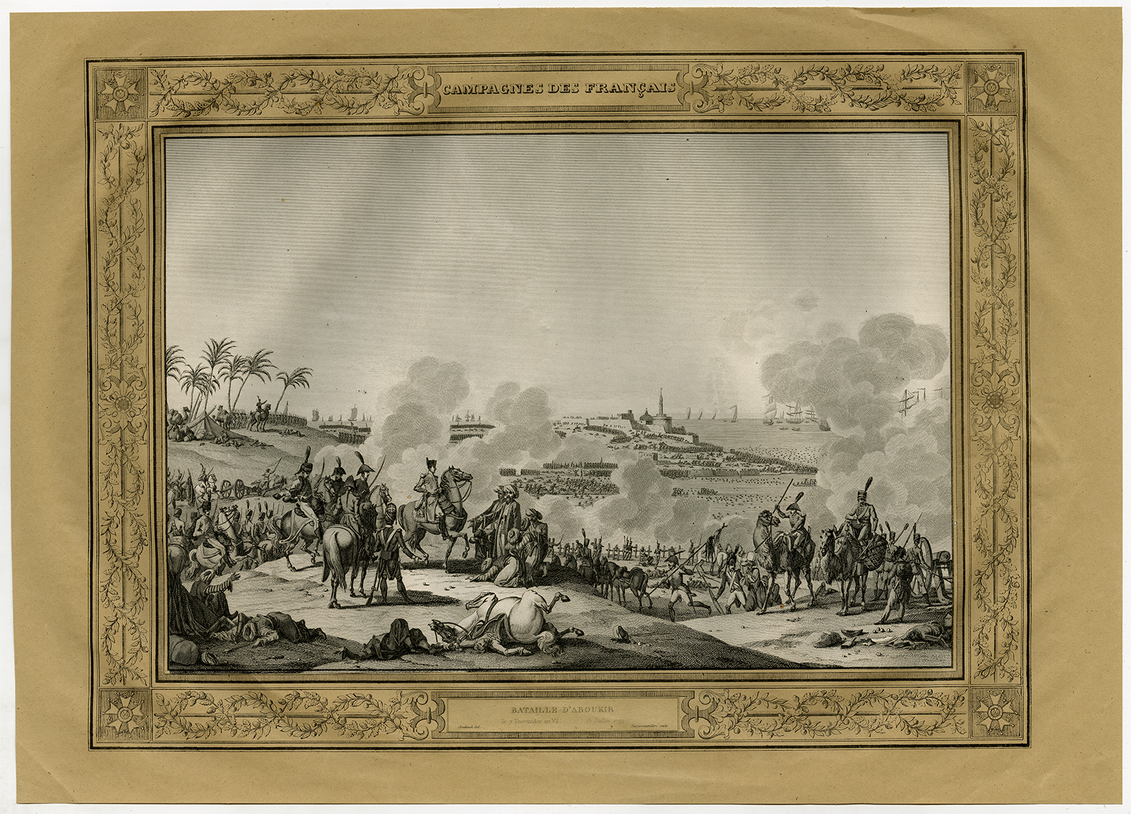 Onderwerp: Antieke prent, getiteld: ”Campagnes des Francais. Bataille d”Aboukir, 25 Juillet 1799.” – Deze originele antieke print toont een strijdtoneel. De Slag om Abukir (of Aboukir of Abu Qir) was een veldslag waarin Napoleon Bonaparte op 25 juli 1799 het Ottomaanse leger van Seid Mustafa Pasha versloeg tijdens de Franse campagne in Egypte.