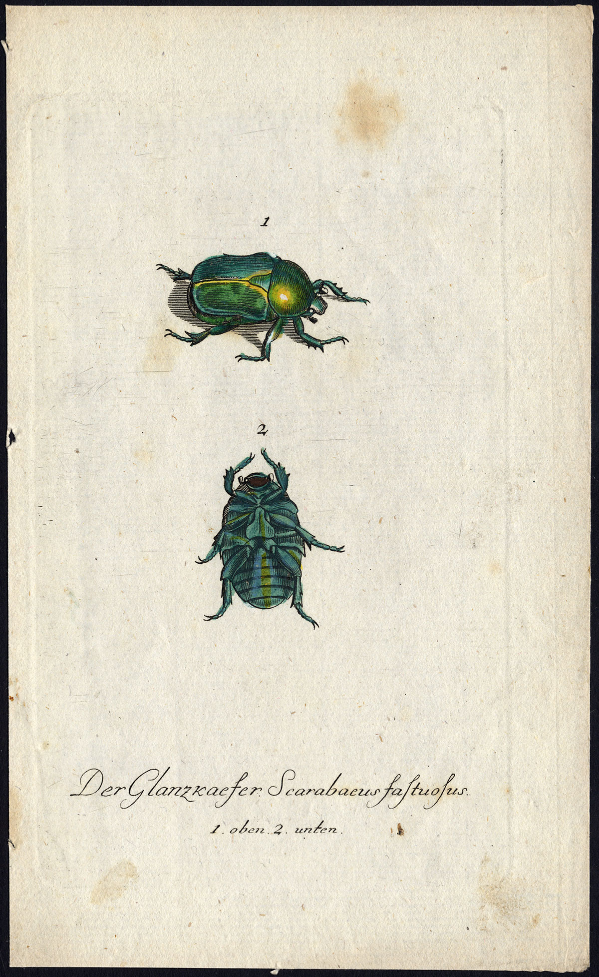 Onderwerp: Origineel bord, getiteld: Der Glanzkaefer. Scarabaeus fastuosus (oben & unten) (Sapkever, boven en onder).