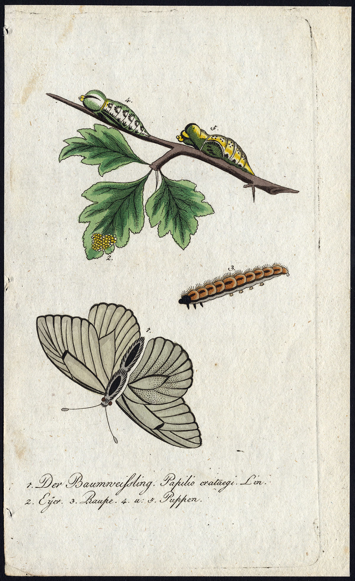 Onderwerp: Origineel bord, getiteld: Der Baumweissling, Papilio crataegi (& Eyer, & Raupe, & Puppen) (Zwartgeaderd Wit, met eieren, larve en pop).