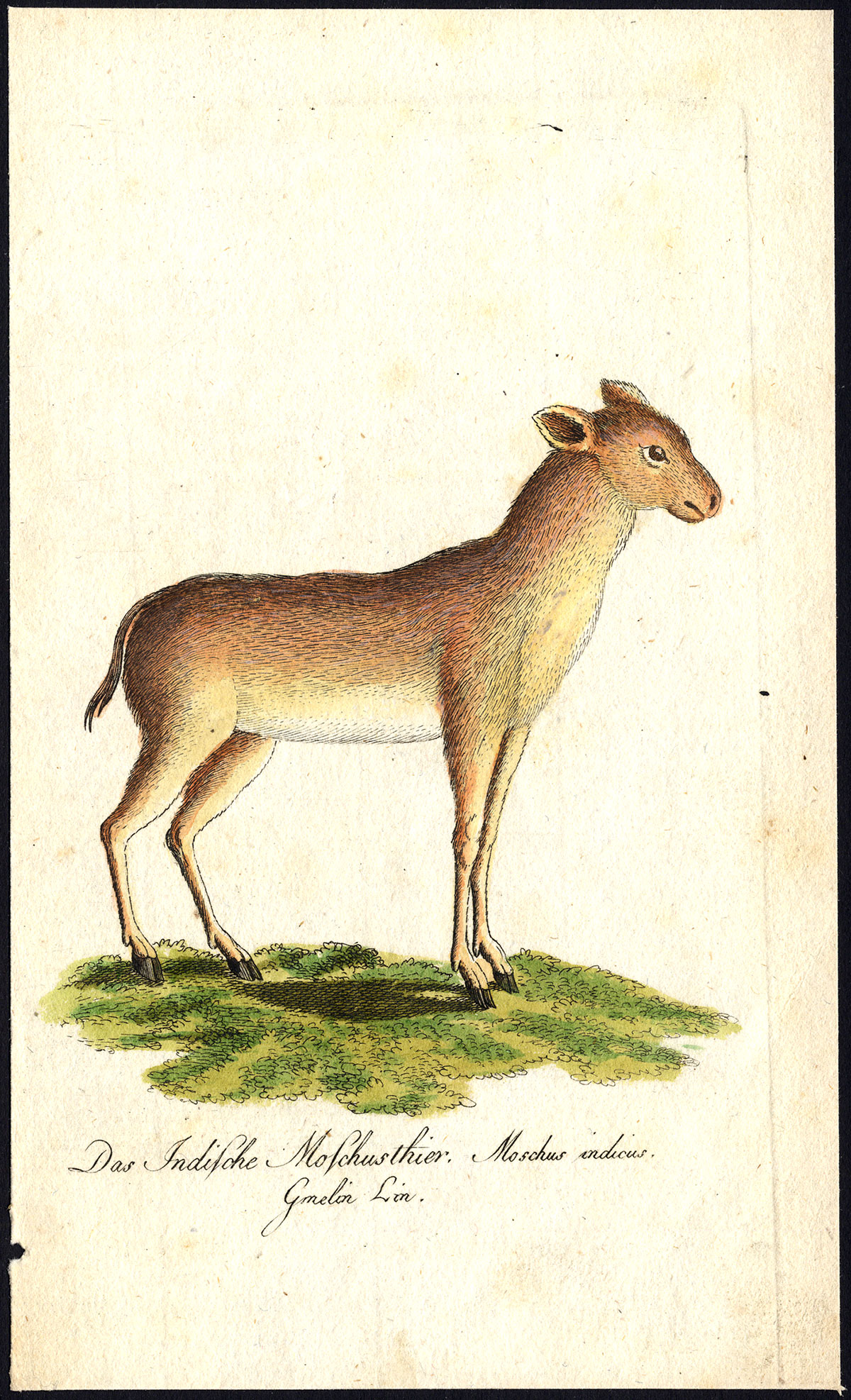 Onderwerp: Origineel bord, getiteld: Der Indische Moschusthier. Moschus indicus (Moschus-hert).