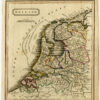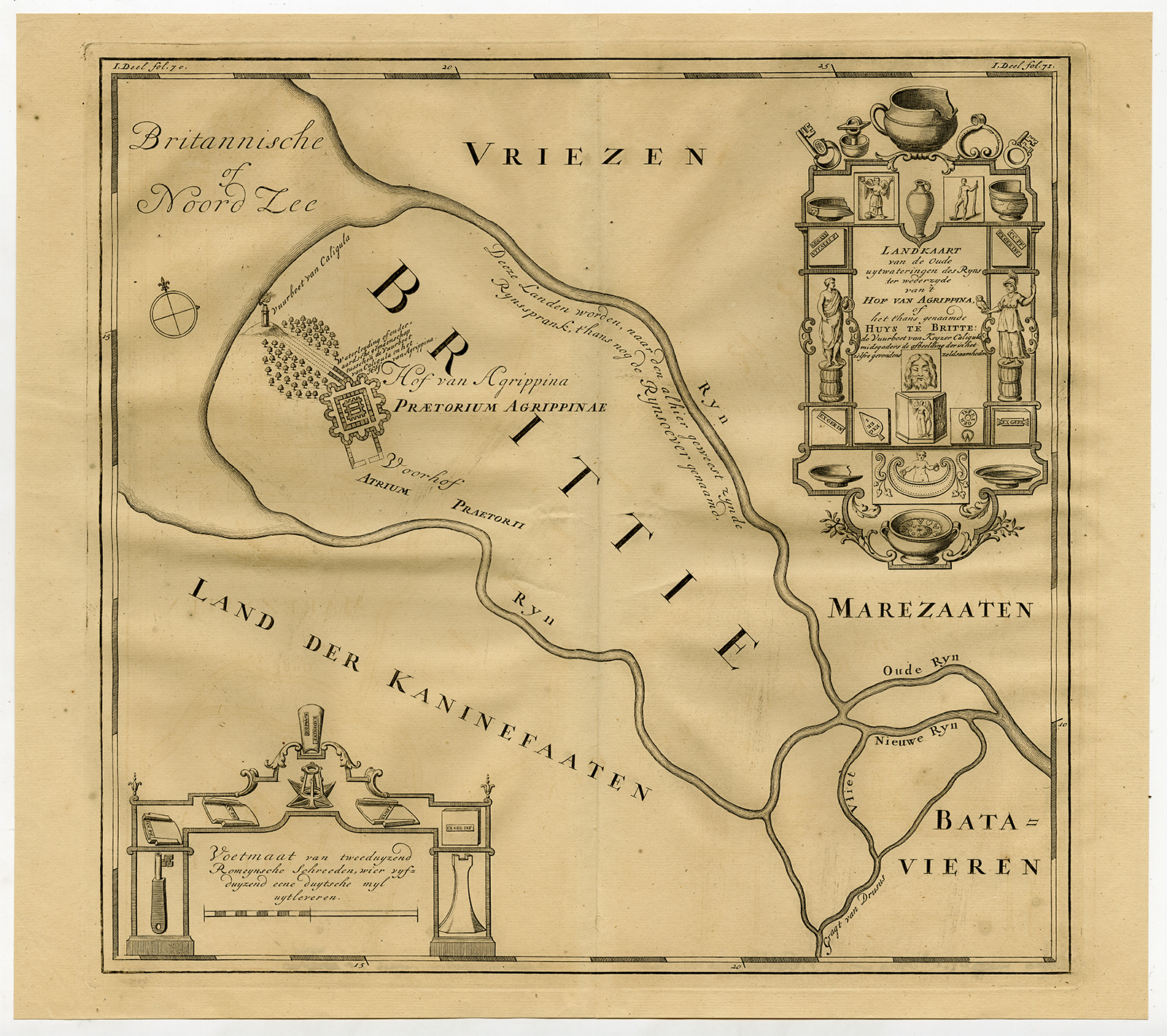 Onderwerp: Antieke prent, getiteld: ”Landkaart van de Oude de uytwateringen des Ryns ter wederzyde van ”t Hof van Agrippina of het thans genaamd Huys te Britte (à).” – Huis van Britte / Hof van Agrippinae en de uitlaat van de Rijn in de Noordzee, Nederland. De fraaie cartouche toont diverse Romeinse archeologische voorwerpen.