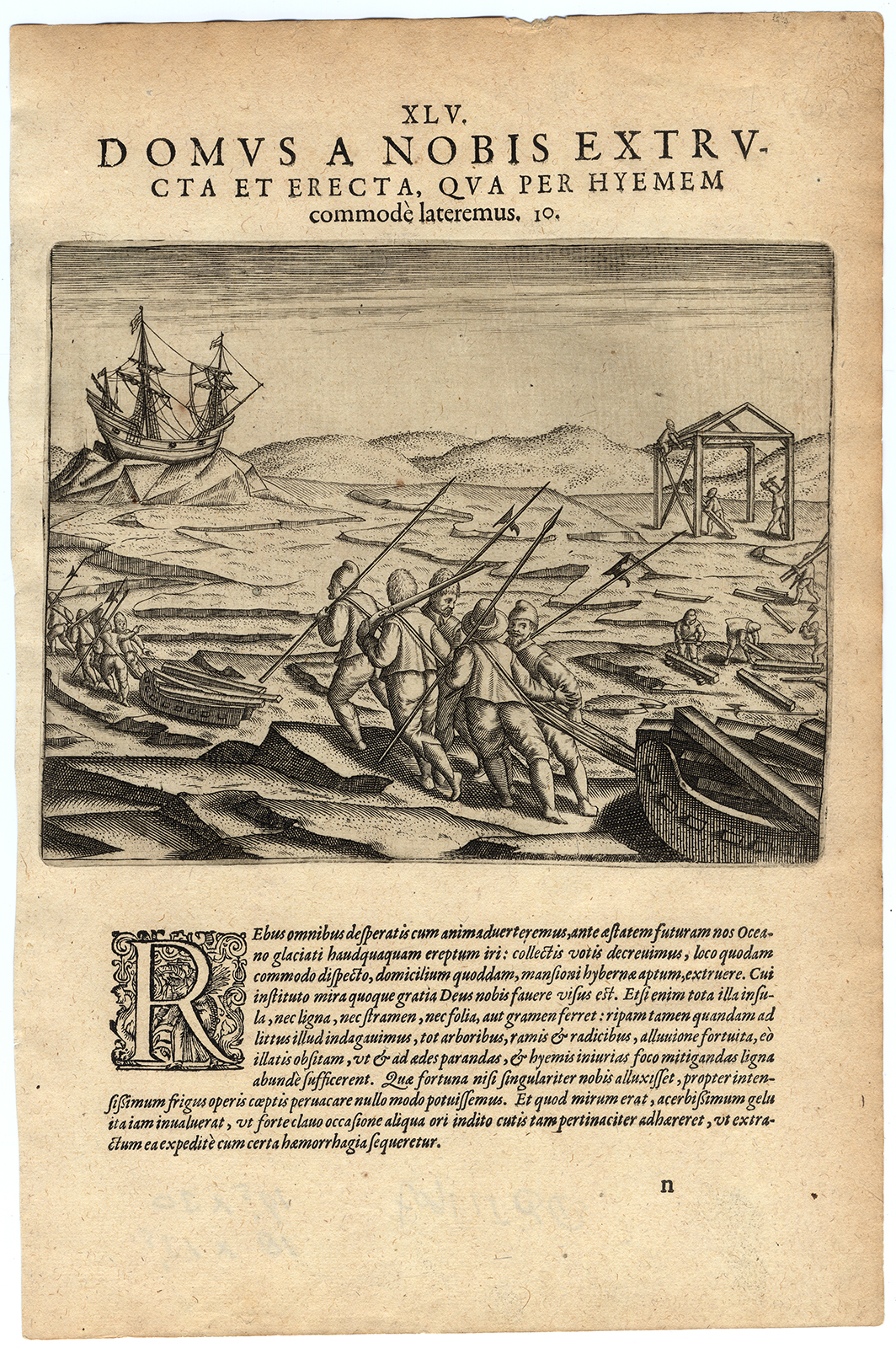 Onderwerp: Plaat 10: Deze plaat toont Willem Barentsz en zijn bemanning tijdens de derde Nederlandse poolreis om de noordoostelijke doorgang naar India te vinden. Op de achtergrond hun schip, rechts de bouw van een huis. Barentsz maakte drie reizen (1594, 1595, 1596-1597) op zoek naar de noordoostelijke doorgang naar Azië. Hij bereikte Novaya Zemlya tijdens de eerste twee expedities. Op de derde ontdekte hij per ongeluk Spitsbergen, rond de noordpunt van Nova Zembla en kwam vast te zitten in het ijs. Na de poolwinter vertrok de bemanning in twee kleine boten naar het vasteland. Barentsz stierf onderweg. De omvang van zijn verkenningen en de nauwkeurigheid van zijn kaarten maakten hem tot een van de belangrijkste poolreizigers. De meteorologische gegevens die Barentsz verzamelde, worden nog steeds geraadpleegd. Tekst in het Latijn.