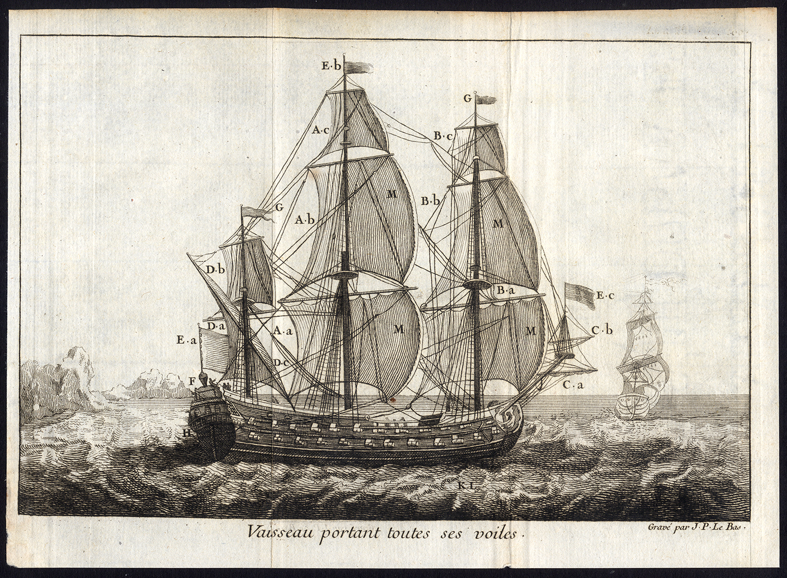 Onderwerp: Plaat: ‘Vaisseau portant toutes ses voiles.’ Dit bord toont een 18e-eeuws oorlogsschip onder vol zeil.