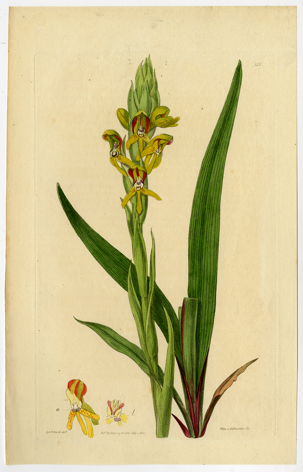Kunstenaars en graveurs: Gemaakt door ‘White’ naar ‘Sydenham Edwards’. Gegraveerd door White naar Sydenham Edwards. Sydenham Teast Edwards [1768 – 1819) de zoon van Lloyd Pittell Edwards, een schoolmeester die een eerste fulltime kunstenaar werd die voor Curtis’s Botanical Magazine werkte. Edwards had na 27 jaar een meningsverschil met de opvolger van Curtis. Hij richtte zijn eigen tijdschrift op, het Botanisch Register. De illustraties van Edwards bleken enorm populair. Hij bloeide op in een periode waarin avontuurlijke verzamelexpedities werden ondernomen naar voorheen onbekende uithoeken van de aarde. Deze expedities spraken tot de verbeelding van het publiek en het verlangen naar nieuwe planten en illustraties leek eindeloos. Tegen deze achtergrond produceerde Edwards in een verbazingwekkend tempo platen: tussen 1787 en 1815 produceerde hij alleen al voor het Botanical Magazine meer dan 1.700 aquarellen.