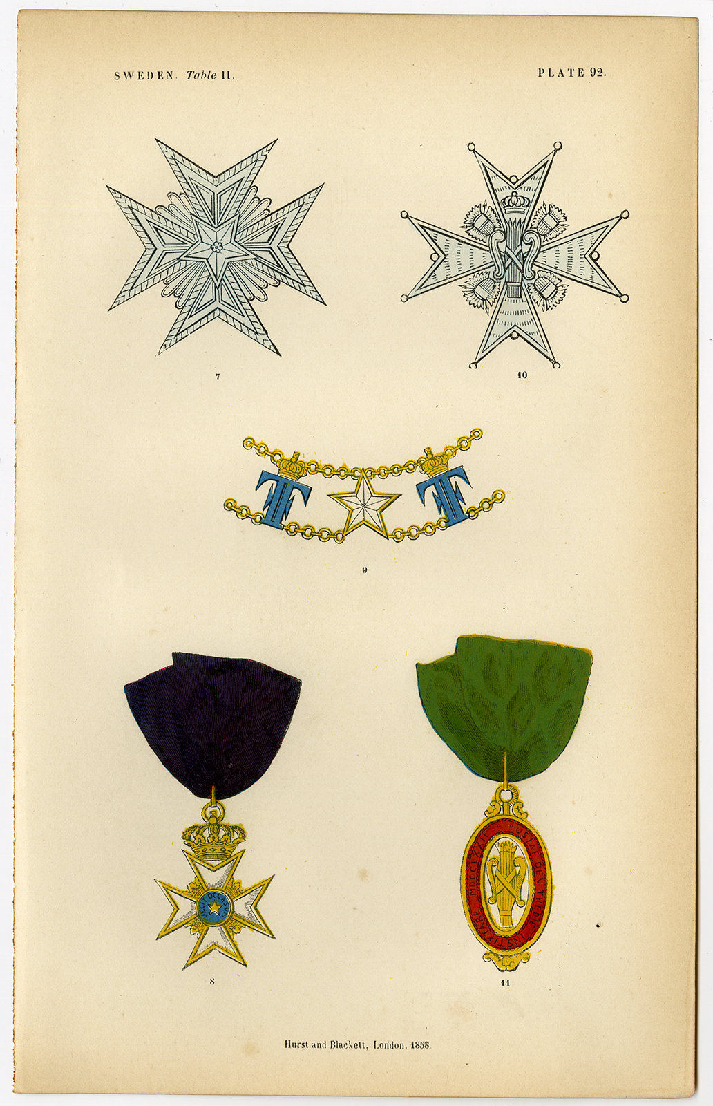 Antieke prent-ORDE VAN HET ZWAARD-ZWEDEN-DECORATIE-MEDAAL-PLAAT 92-Burke-1858