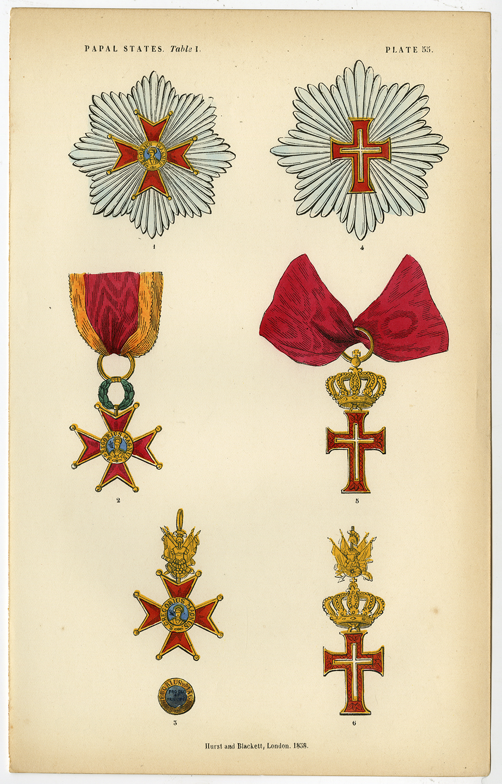 Onderwerp: Plaat 55: Dit bord behandelt ridderorden en eretekens en toont de Orde van Sint Gregorius de Grote en andere medailles van verdienste en onderscheidingen van de Pauselijke Staten.