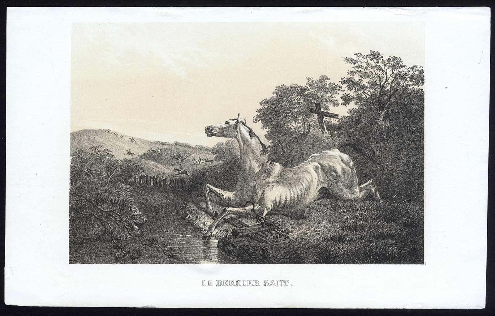 Onderwerp: Plaat: ‘Le dernier saut’. (De laatste sprong). Dit bord toont een oud paard. Op de achtergrond een paardenrace.