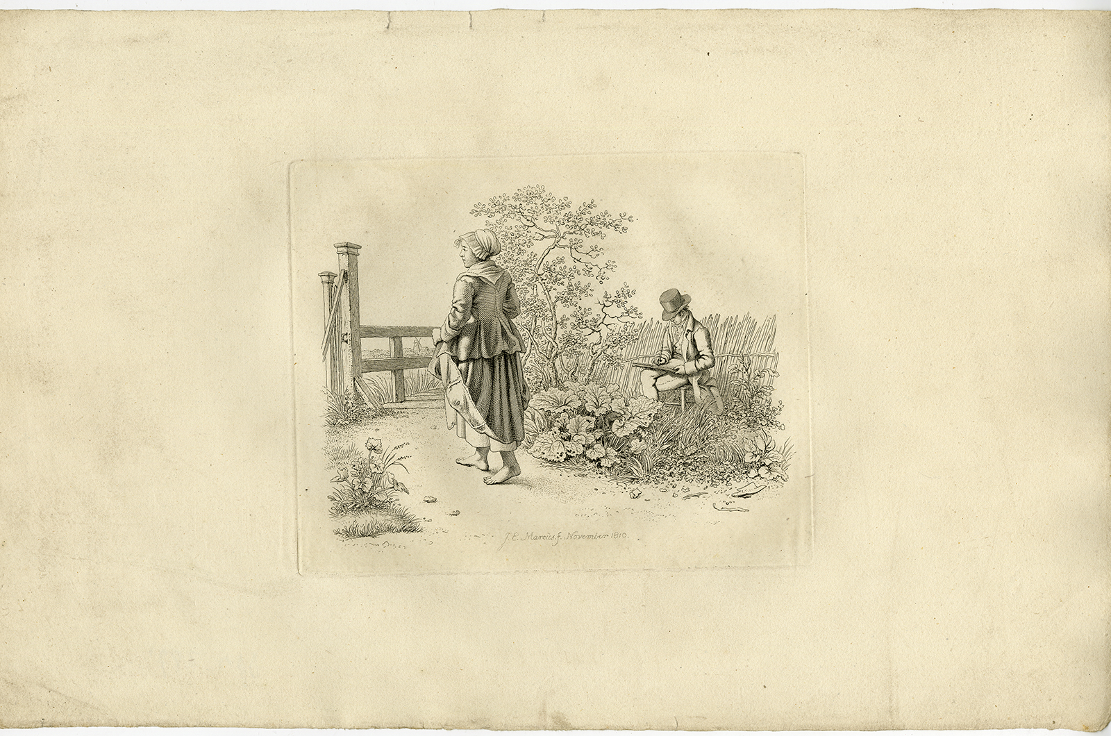 Onderwerp: Antieke druk, zonder titel. Een buitentafereel met een man en een vrouw. De heer zit te schetsen terwijl de vrouwelijke figuur langsloopt richting een poort.