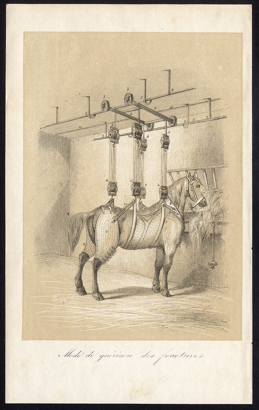 Onderwerp: Plaat: ‘Mode de guerison des fractures’. (Een methode voor breukgenezing). Deze plaat toont een paard dat door een takel wordt vastgehouden om te herstellen van breuken.