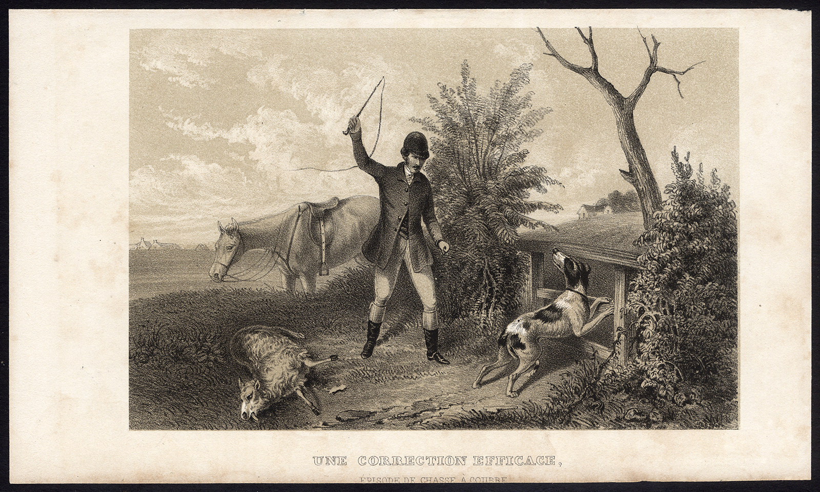 Onderwerp: Plaat: ‘Une correction efficace’. (Een efficiënte correctie). Dit bord toont een man die een hond straft met een zweep. Op de achtergrond zijn paard en linksonder een dood schaap..
