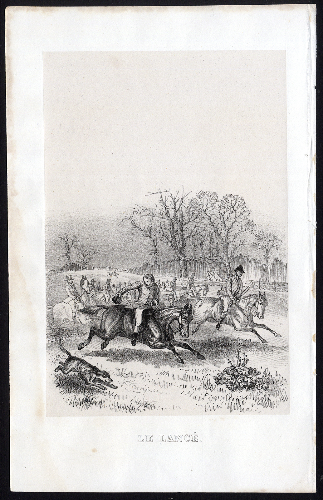 Onderwerp: Plaat: ‘Le Lance’. Dit bord toont een jachttafereel met paarden en een hond.