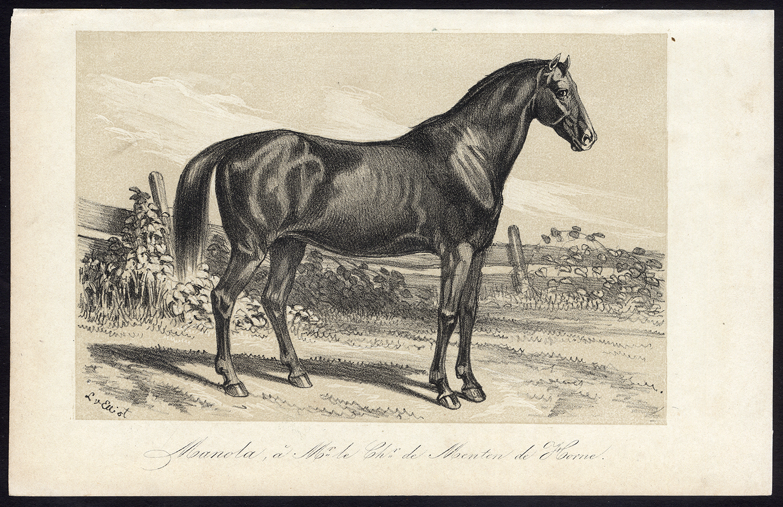 Onderwerp: Plaat: ‘Manola, een heer Le Chr. De Menten deHorne’. Op dit bord staat het paard Manola afgebeeld.